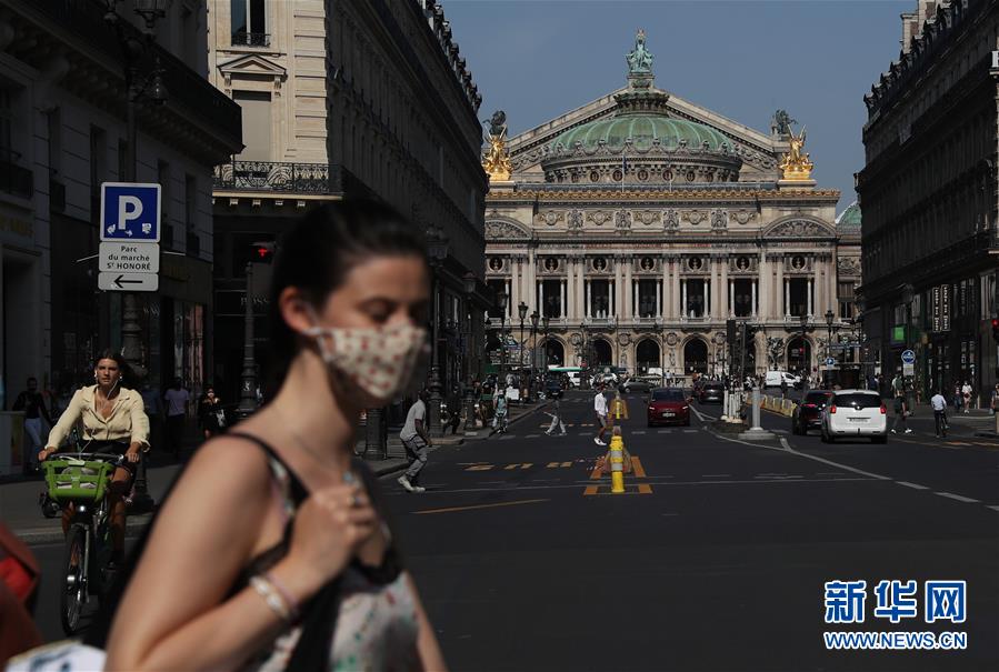 9月16日,行人戴口罩走在法国巴黎歌剧院附近。 法国政府网站16日公布的数据显示,法国累计新冠确诊病例404888例。 新华社记者 高静 摄