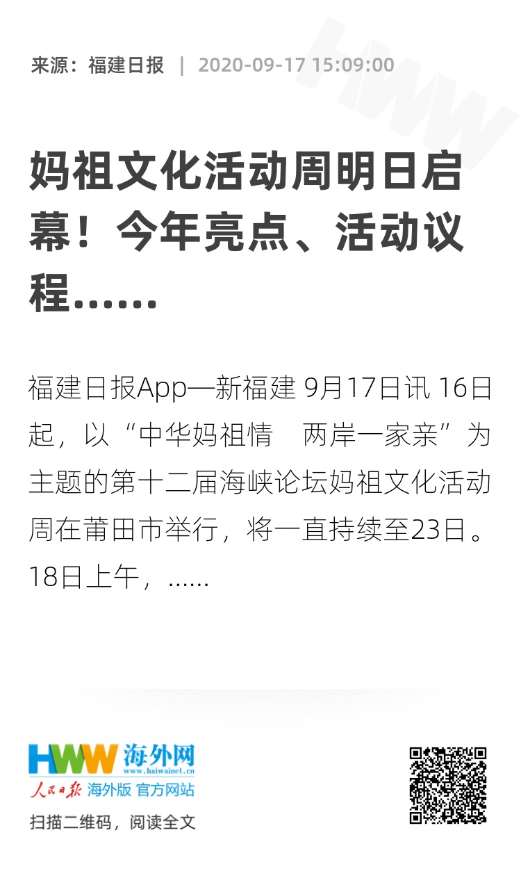 福建日报App—新福建 9月17日讯 16日起,以“中华妈祖情 两岸一家亲”为主题的第十二届海峡论坛妈祖文化活动周在莆田市举行,将一直持续至23日。18日上午,此次妈祖文化活动周开幕式将在湄洲岛世界妈祖文化论坛永久会址举行。与往年不同,开幕式将采用线上线下互动方式,举办相关活动。