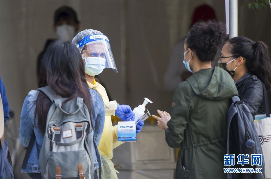 9月17日,在加拿大多伦多一处新冠病毒检测中心外,一名身穿防护服的安保人员为排队等候检测的人消毒手部。 加拿大累计新冠确诊病例升至140539例,累计死亡9199例。 新华社发(邹峥摄)