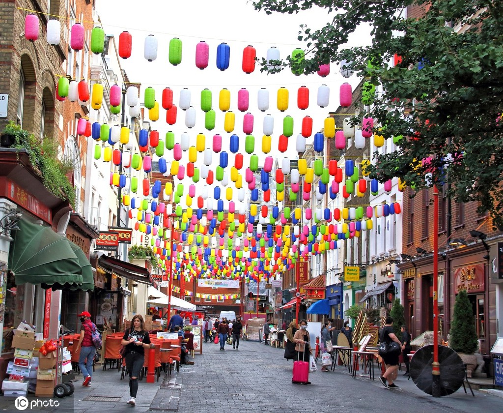 当地时间2020年9月16日,英国伦敦,伦敦唐人街挂着数千盏新的彩色灯笼,这些彩色灯笼取代了原先挂着的传统红色灯笼。图片来源:东方IC