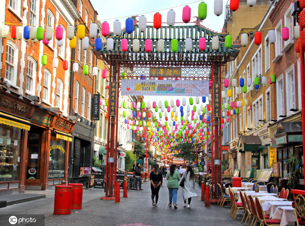 当地时间2020年9月16日,英国伦敦,伦敦唐人街挂着数千盏新的彩色灯笼,这些彩色灯笼取代了原先挂着的传统红色灯笼。图片来源:东方IC