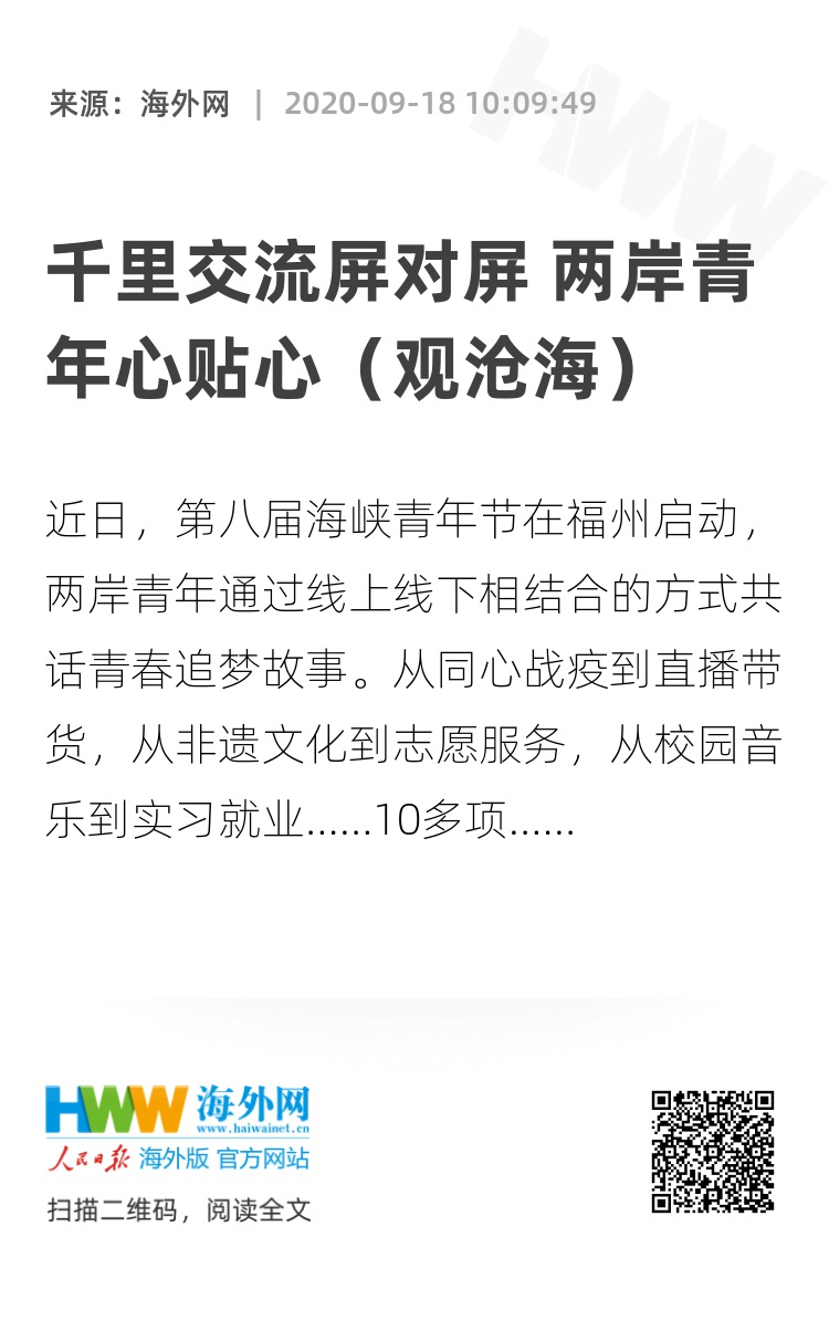 千里交流屏对屏,两岸青年心贴心。今年的海峡青年节最特别之处在于一个“云”字,“云上峰会”“云加油”“云游海峡”等活动通过线上直播的方式,在北京、厦门、台北等多地设置分会场,两岸青年以“云”为媒,架起沟通的桥梁。“这里是北京故宫”“这里是杭州的阿里巴巴”“这里是平潭的网红民宿”……台湾青年用镜头讲述他们在大陆各个地方的逐梦故事,引发两岸青年共鸣。这些两岸青年交流活动顺应疫情防控要求与互联网发展趋势,从线下走到了线上,突破了空间界限,让更多青年参与其中。