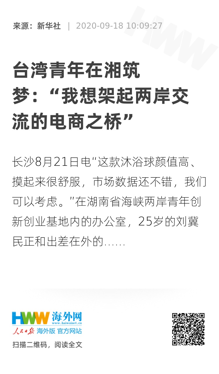 新华社长沙8月21日电“这款沐浴球颜值高、摸起来很舒服,市场数据还不错,我们可以考虑。”在湖南省海峡两岸青年创新创业基地内的办公室,25岁的刘冀民正和出差在外的同事开视频会议,为公司线上店铺选择商品。