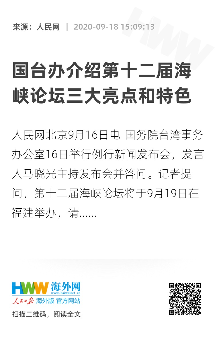 新华社记者提问,第十二届海峡论坛将于9月19日在福建举办,请问本届论坛有哪些特点、特色和亮点?台陆委会针对论坛提出所谓“三禁”进行限制阻挠,对此有何评论?