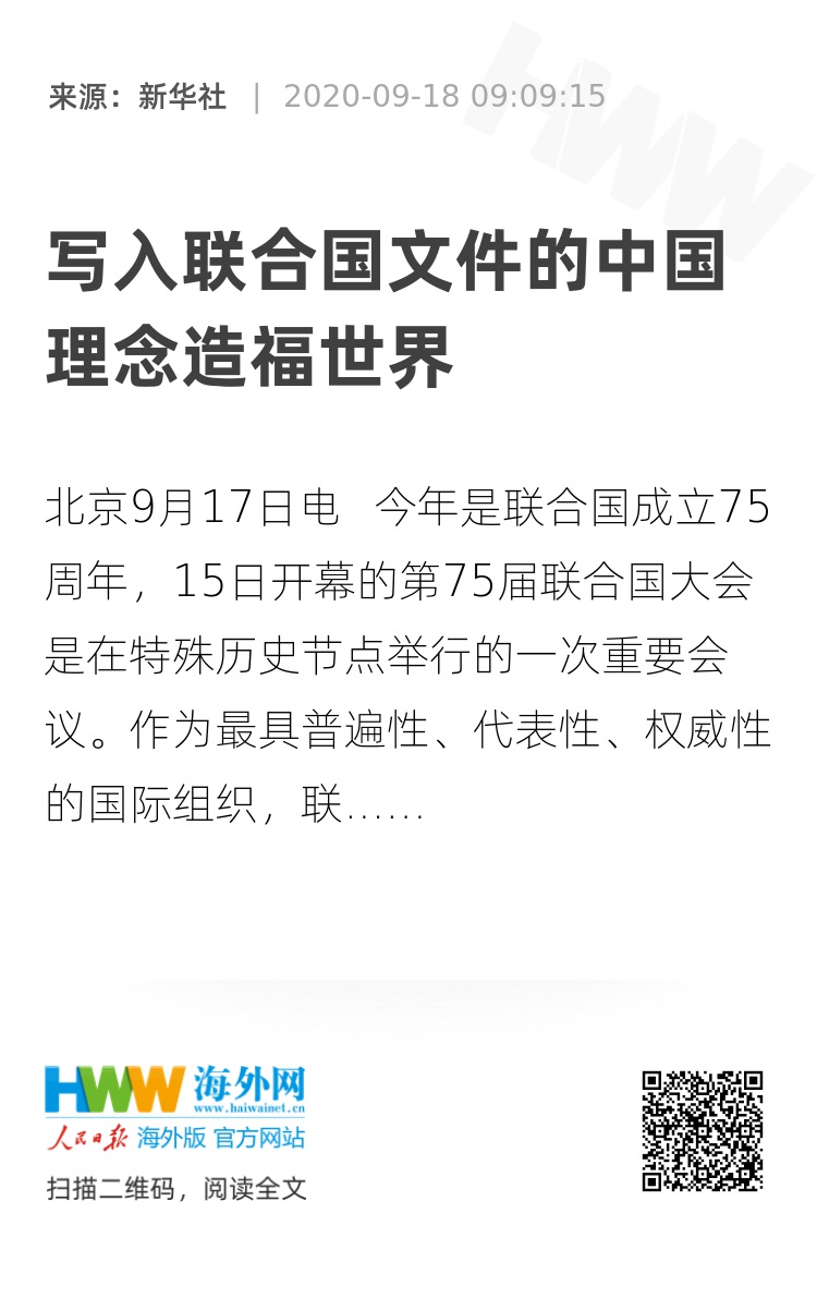 新华社北京9月17日电 今年是联合国成立75周年,15日开幕的第75届联合国大会是在特殊历史节点举行的一次重要会议。作为最具普遍性、代表性、权威性的国际组织,联合国近年来多次将人类命运共同体等中国理念写入官方文件,彰显国际社会的广泛认同和积极响应。