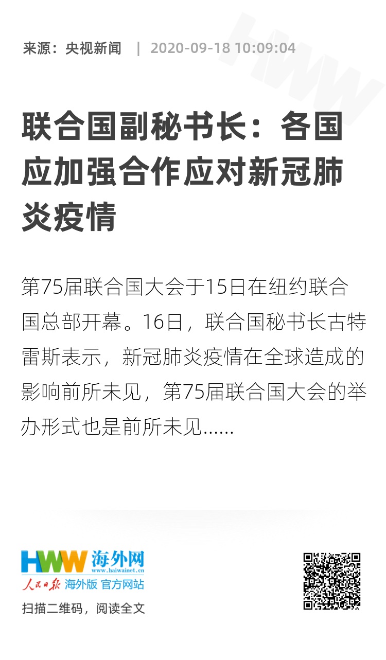 联合国副秘书长、联合国成立75周年秘书长特别顾问 法布里齐奥·霍克希尔德:在新冠肺炎疫情中我们了解到,当各国无间合作就能挽救生命,当彼此合作不好就会失去生命,所以疫情悲伤而痛苦地提醒着我们国际合作有多么重要,让国际合作适应新出现的挑战有多么重要。