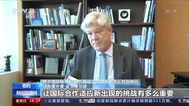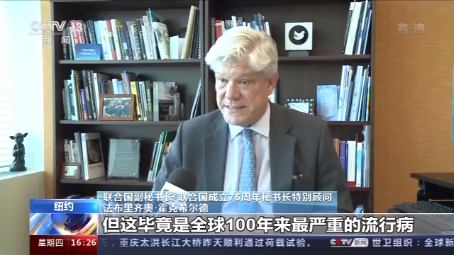 第75届联合国大会于15日在纽约联合国总部开幕。16日,联合国秘书长古特雷斯表示,新冠肺炎疫情在全球造成的影响前所未见,第75届联合国大会的举办形式也是前所未见的。央视记者近日就应对新冠肺炎疫情等话题,对联合国负责75周年庆祝活动的副秘书长兼特别顾问法布里齐奥·霍克希尔德进行了独家专访。霍克希尔德也呼吁国际社会加强合作,应对疫情。