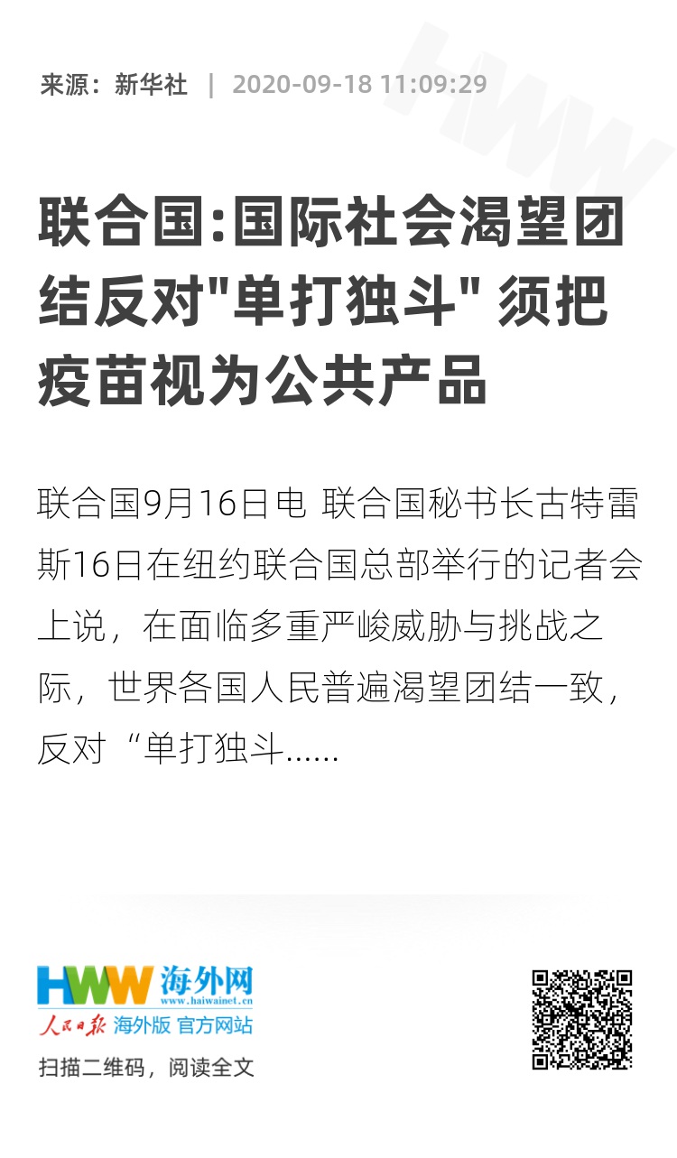 古特雷斯敦促国际社会团结一致,共同抗击新冠疫情。他强调,必须把疫苗视为一种“全球公共产品”,“因为新冠病毒没有国界”。
