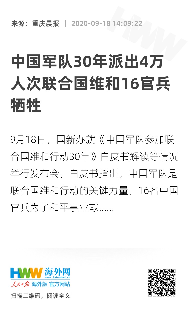9月18日,国新办就《中国军队参加联合国维和行动30年》白皮书解读等情况举行发布会,白皮书指出,中国军队是联合国维和行动的关键力量,16名中国官兵为了和平事业献出了宝贵生命。