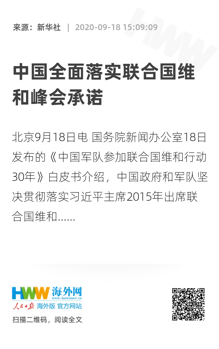 新华社北京9月18日电 国务院新闻办公室18日发布的《中国军队参加联合国维和行动30年》白皮书介绍,中国政府和军队坚决贯彻落实习近平主席2015年出席联合国维和峰会时宣布的支持联合国维和行动的6项承诺,取得一系列重要成果。