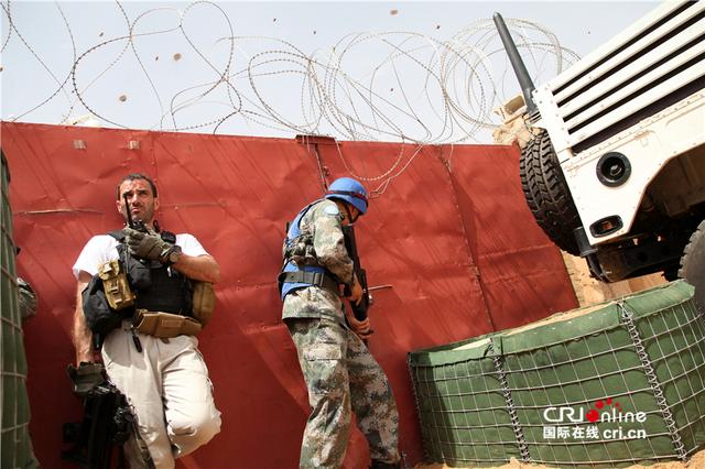 并肩作战。中国首批赴马里维和警卫分队处置大规模民众游行事件,联马团东战区安全官和中国警卫无视头上不停地飞着石块,坚守战位、并肩作战。