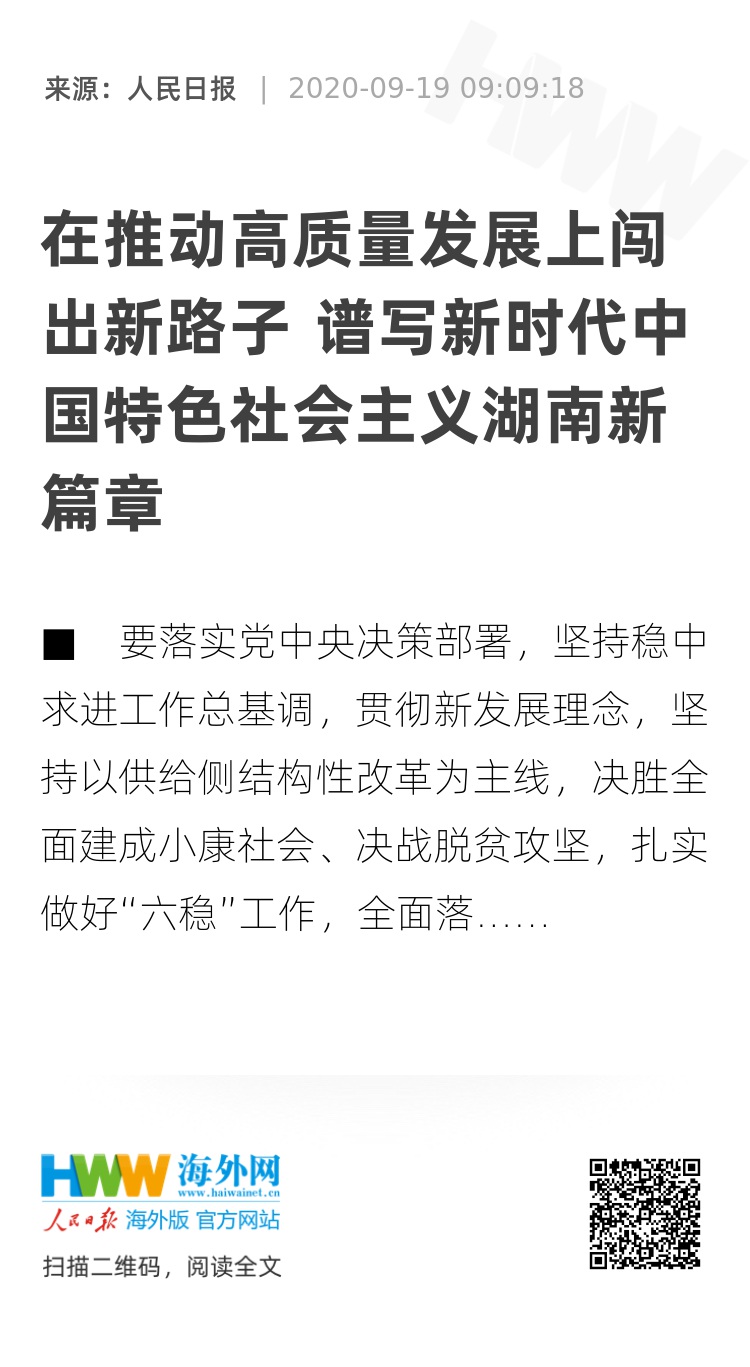 ■ 要落实党中央决策部署,坚持稳中求进工作总基调,贯彻新发展理念,坚持以供给侧结构性改革为主线,决胜全面建成小康社会、决战脱贫攻坚,扎实做好“六稳”工作,全面落实“六保”任务,着力打造国家重要先进制造业、具有核心竞争力的科技创新、内陆地区改革开放的高地,在推动高质量发展上闯出新路子,在构建新发展格局中展现新作为,在推动中部地区崛起和长江经济带发展中彰显新担当,奋力谱写新时代坚持和发展中国特色社会主义的湖南新篇章