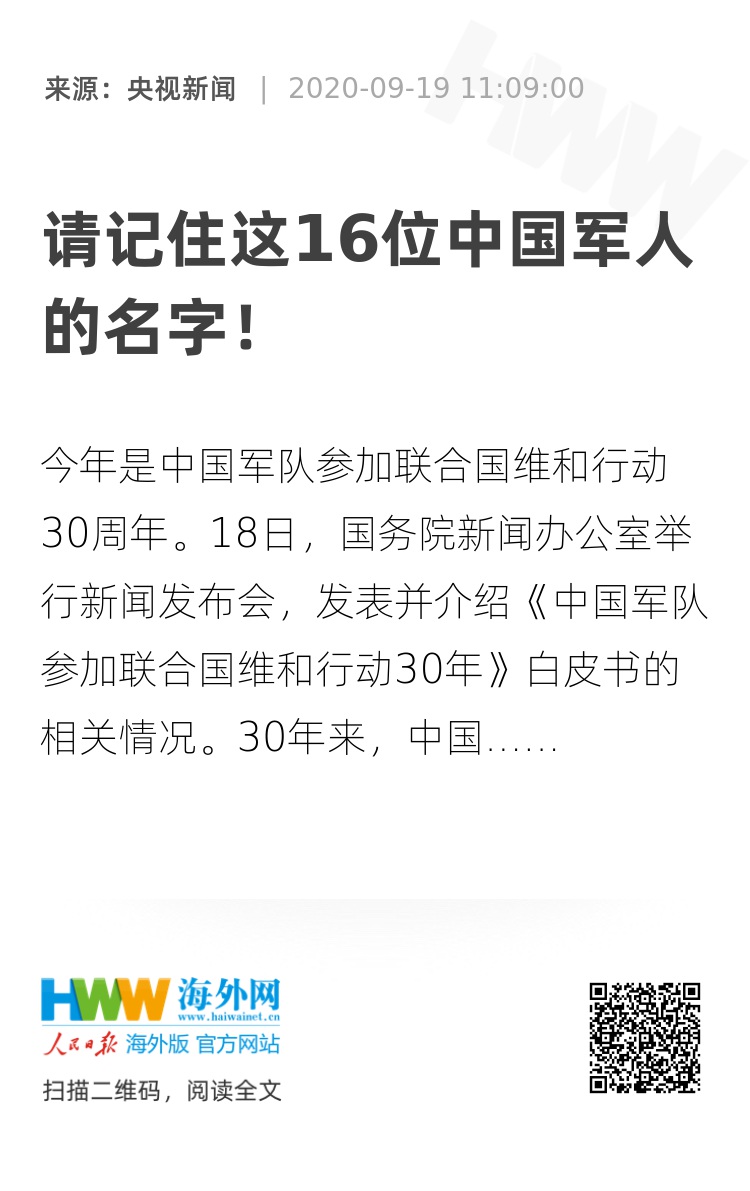 今年是中国军队参加联合国维和行动30周年。18日,国务院新闻办公室举行新闻发布会,发表并介绍《中国军队参加联合国维和行动30年》白皮书的相关情况。30年来,中国军队先后参加25项联合国维和行动,累计派出维和官兵4万余人次,16名中国官兵为了和平事业献出了宝贵生命。他们的名字已被写入《中国军队参加联合国维和行动30年》白皮书第39页。