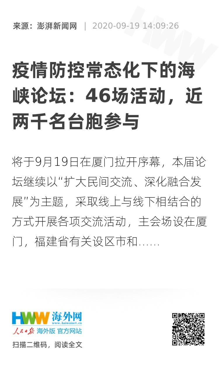 澎湃新闻注意到,今年海峡论坛精选议题,在持续关注服务青年群体、携手弘扬中华文化、助推两岸经济合作、推动两岸应通尽通的同时,紧扣当前抗疫热点,新增卫生防疫、有序复工复产等议题,融入两岸同胞携手抗疫、守望相助、共克时艰的感人故事。