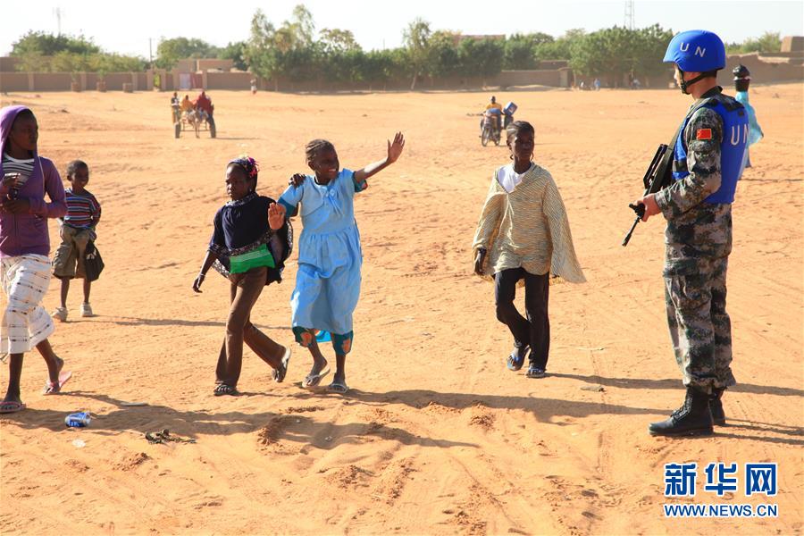 中国赴马里维和警卫分队奉命为联马团排爆小组清理加奥市区残留弹药提供外围防御,路过的孩子向我维和士兵打招呼(2014年1月27日摄)。新华社发