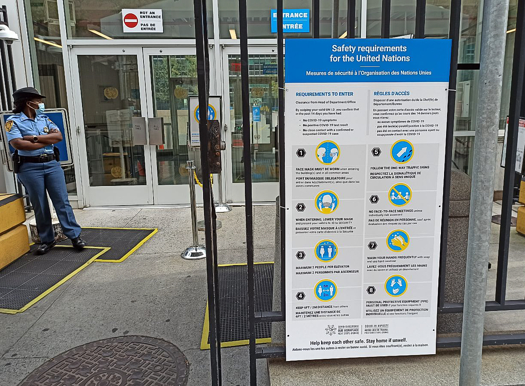 第75届联合国大会持续召开 总部设置防疫标识