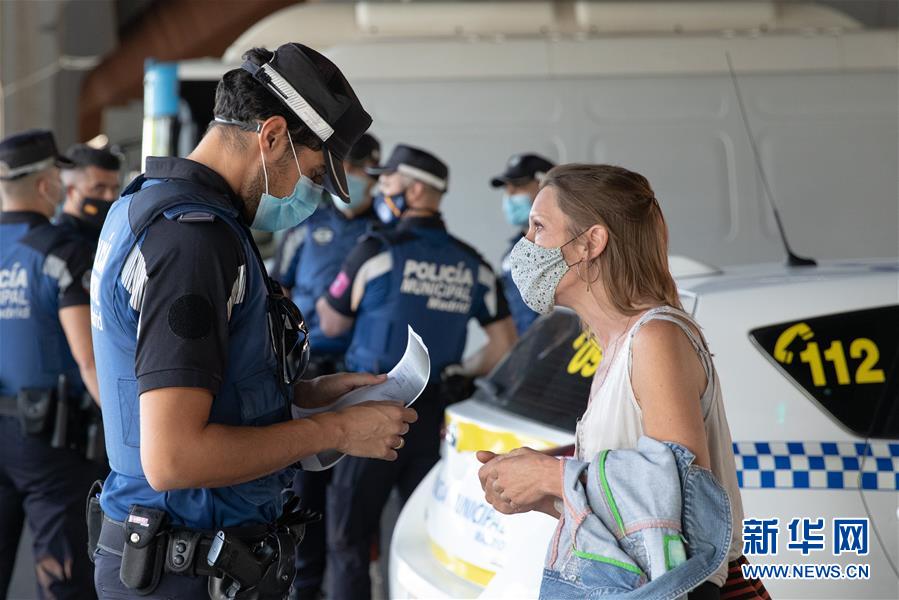 9月21日,在西班牙马德里瓦拉卡斯桥区,警察检查过往行人的出行目的。 西班牙新冠疫情近来出现严重反弹。其中马德里地区疫情最为严重。从21日零时开始,马德里市的乌塞拉、线型之都、瓦拉卡斯桥等6个城区和马德里周边的赫塔菲等7个市镇的共37个基本卫生区执行至少为期14天的限行政策,以限制人员流动。 新华社记者 孟鼎博 摄