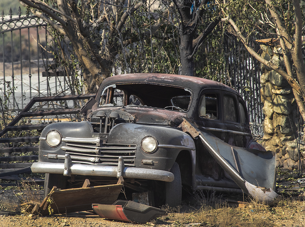 当地时间2020年9月20日,美国加州“山猫大火”肆虐,留下狼藉一片,部分地区的灭火工作持续中。图片来源:视觉中国。