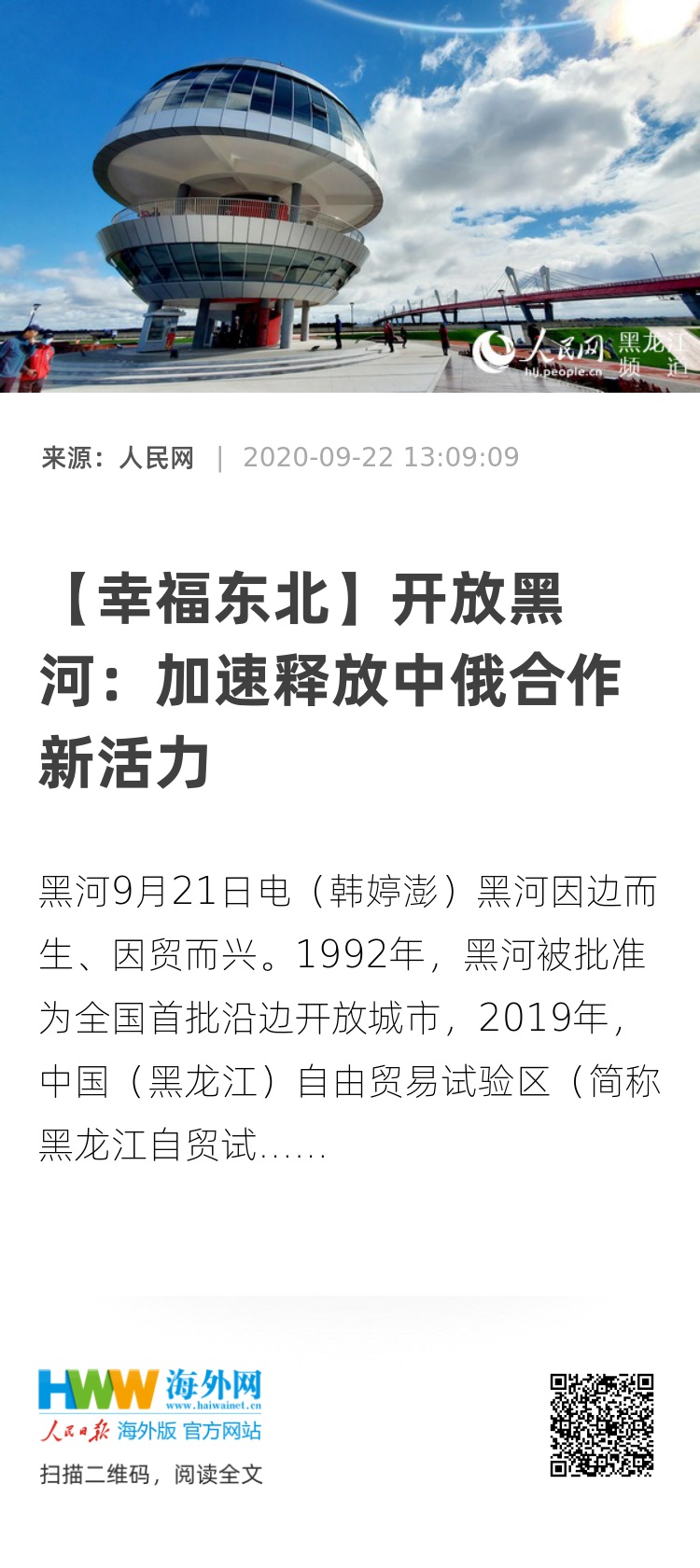 人民网黑河9月21日电(韩婷澎)黑河因边而生、因贸而兴。1992年,黑河被批准为全国首批沿边开放城市,2019年,中国(黑龙江)自由贸易试验区(简称黑龙江自贸试验区)黑河片区挂牌,“两次开放”给黑河对俄经贸带来了勃勃生机。