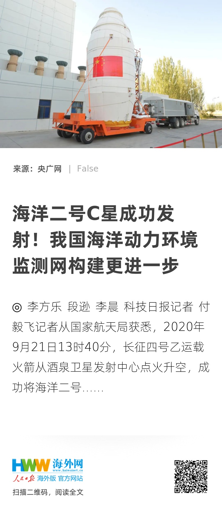 记者从国家航天局获悉,2020年9月21日13时40分,长征四号乙运载火箭从酒泉卫星发射中心点火升空,成功将海洋二号C星送入预定轨道。