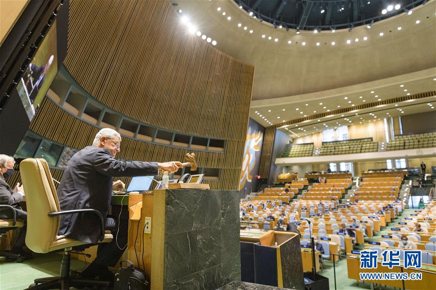 9月22日,在位于纽约的联合国总部,第75届联合国大会主席博兹克尔(前)宣布联合国大会一般性辩论开幕。 第75届联合国大会一般性辩论22日在纽约联合国总部拉开帷幕。约170位国家元首和政府首脑预计将就新冠疫情、2030年可持续发展议程、气候变化和其他重大国际问题发表讲话。 新华社发(联合国供图)