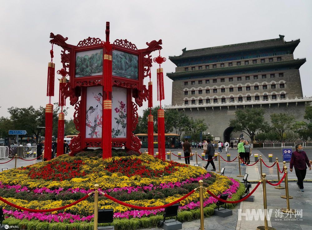 2020年9月23日报道,北京前门大街及周边装扮一新,花团锦簇,喜迎国庆、中秋佳节到来。(供图:东方IC)