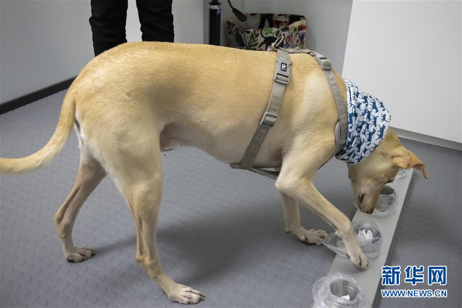 9月22日,在芬兰赫尔辛基万塔国际机场举行的新闻发布会上,一只嗅探犬对拭子样本进行嗅闻。 新华社发(马蒂·马蒂凯宁摄)