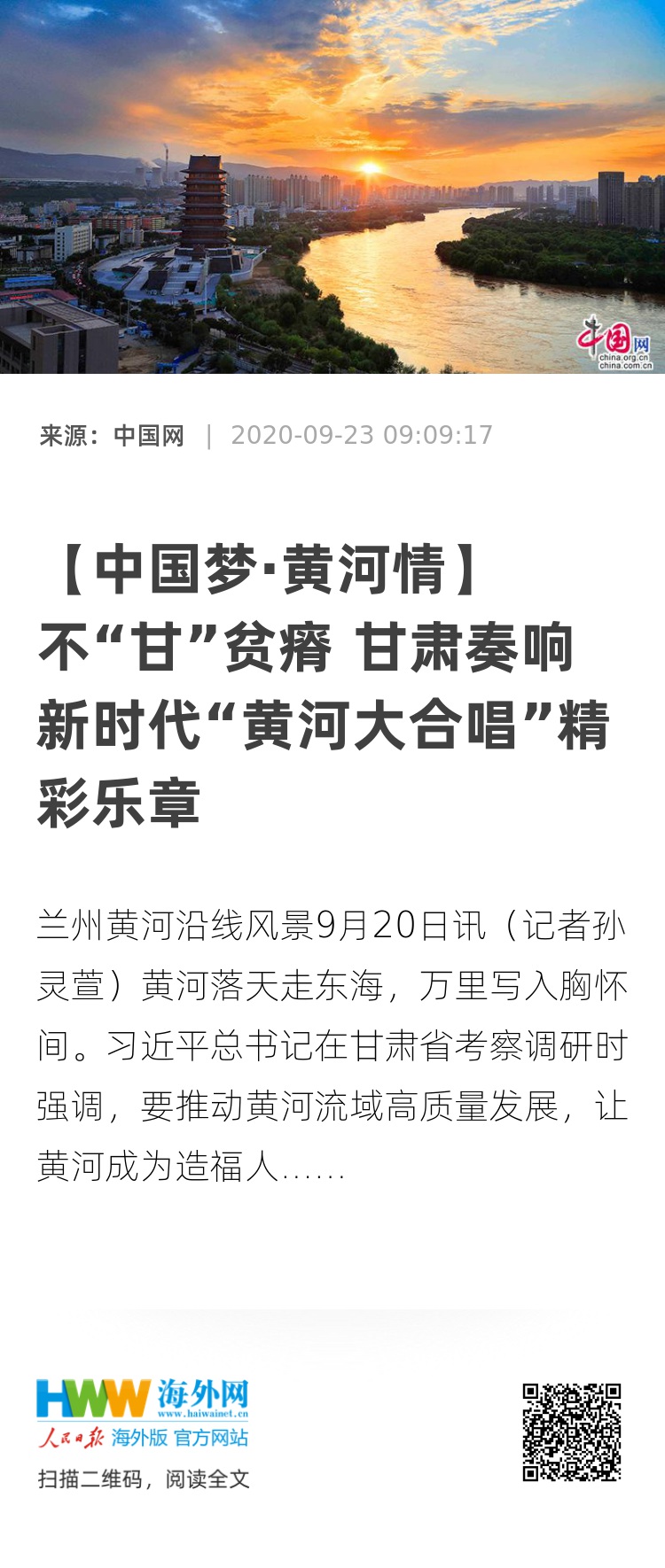 中国网9月20日讯(记者孙灵萱)黄河落天走东海,万里写入胸怀间。习近平总书记在甘肃省考察调研时强调,要推动黄河流域高质量发展,让黄河成为造福人民的幸福河。黄河、长江都是中华民族的母亲河,保护母亲河是事关中华民族伟大复兴和永续发展的千秋大计。