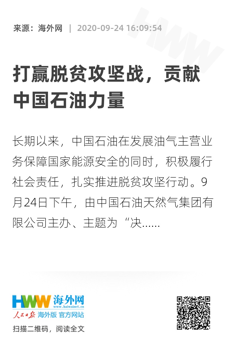 扶危济困,责能致远。今年是脱贫攻坚收官之年,也是全面建成小康社会关键之年。烙印着共和国红色基因的中国石油,必将慎终如始、再接再厉,以更高的标准、更大的力度、更实的举措做好扶贫工作,助力打赢脱贫攻坚战,为全面建成小康社会作出更大贡献。(海外网 王晶、吴迪)