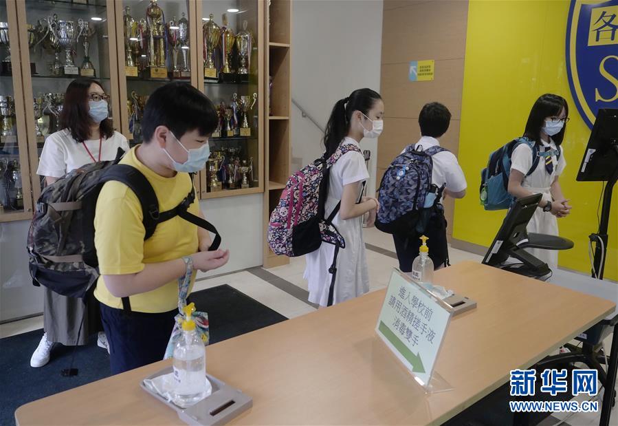 9月23日,在位于香港湾仔的圣公会圣雅各小学,小学生进校前测量体温,消毒双手。 新华社记者 王申 摄