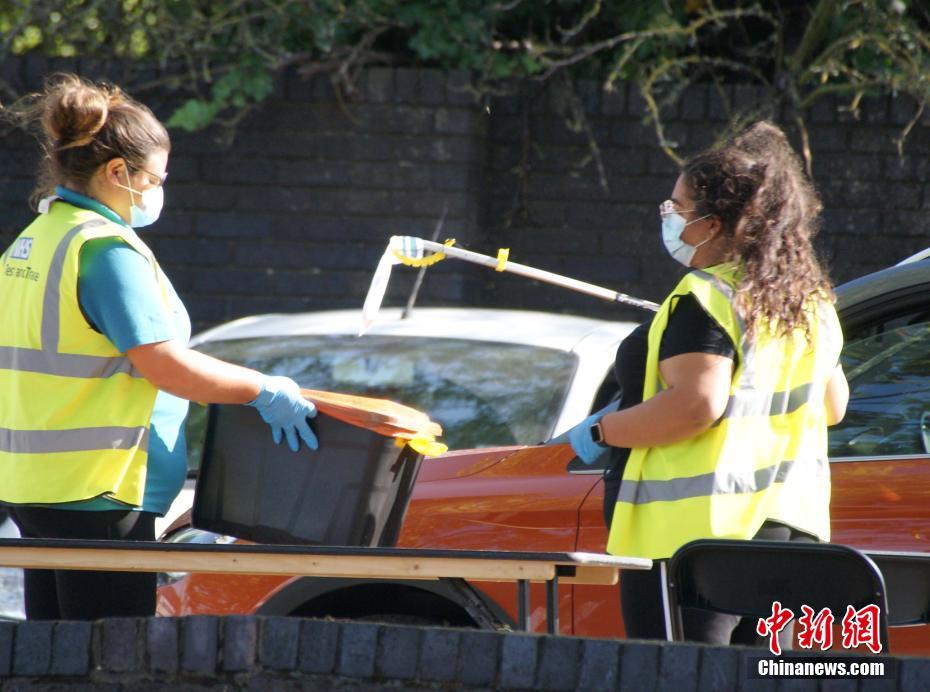 当地时间9月23日,英国新增新冠确诊数高达6178例,创下了5月1日以来的新高,累计确诊病例数达409729例。图为伦敦核酸检测人员用长杆夹将受检者的生物样本放入收纳箱。 中新社发 高天胤 摄