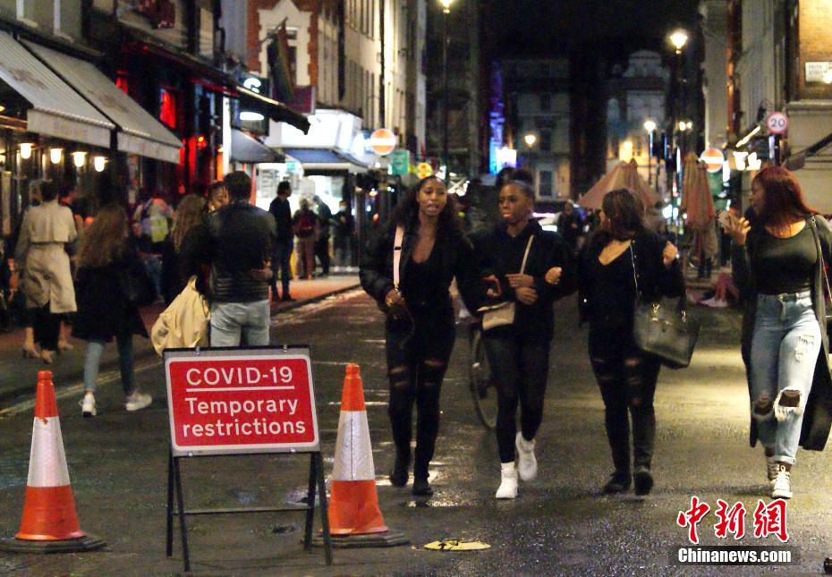 当地时间9月23日,英国新增新冠确诊数高达6178例,创下了5月1日以来的新高,累计确诊病例数达409729例。图为在强制执行“酒吧晚上10点关闭”防疫新规的前夜,伦敦一酒吧街上人流络绎不绝。 中新社发 高天胤 摄