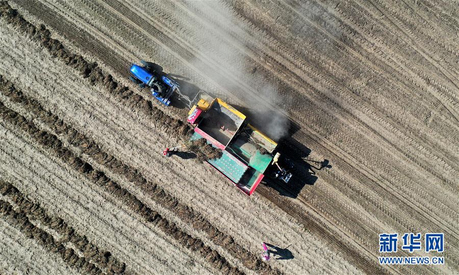 9月23日,台安县桑林镇桑林村村民运用农机为收割完的花生摘果(无人机照片)。 目前正值辽宁省鞍山市台安县花生大面积收获的季节,广大农民抢抓农时,运用农业机械适时收获,田间地头一派繁忙景象。 新华社记者 姚剑锋 摄
