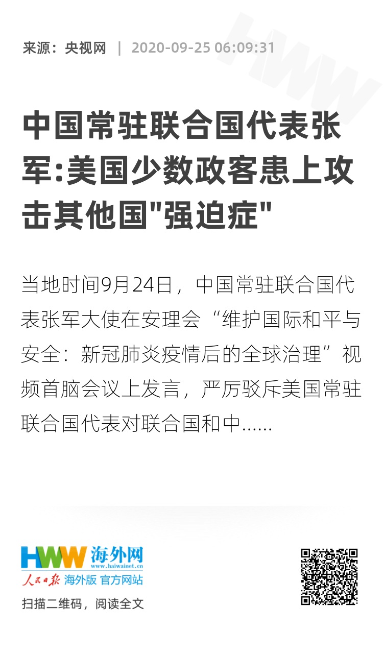 当地时间9月24日,中国常驻联合国代表张军大使在安理会“维护国际和平与安全:新冠肺炎疫情后的全球治理”视频首脑会议上发言,严厉驳斥美国常驻联合国代表对联合国和中国的恶意攻击。