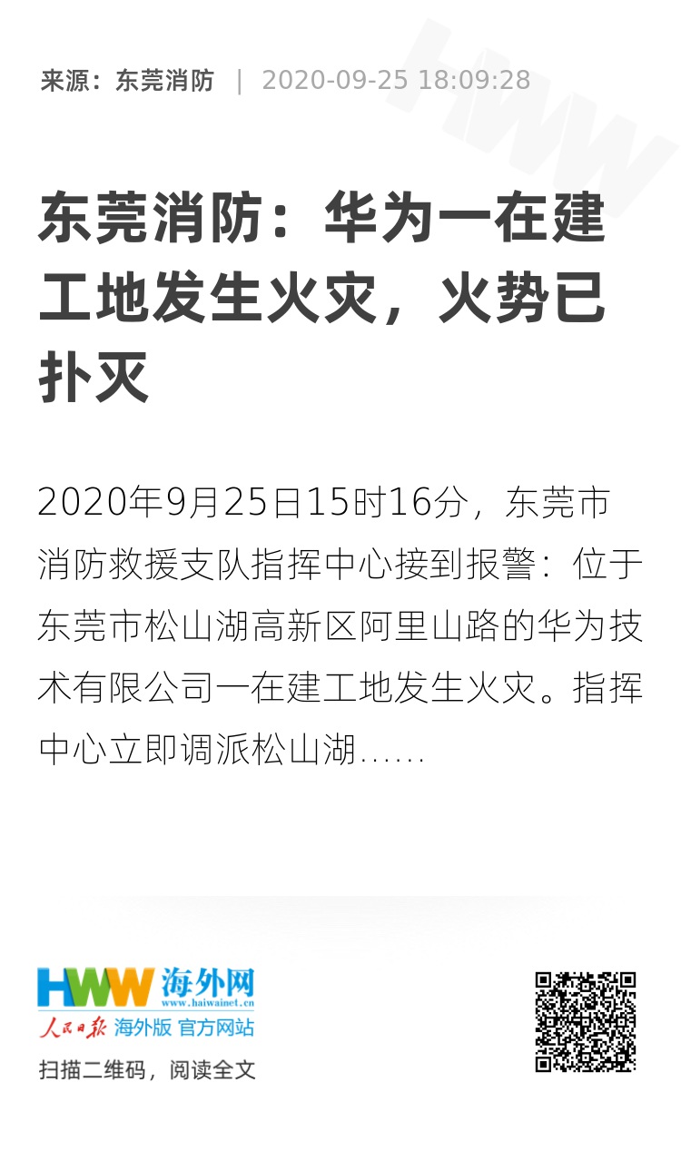 2020年9月25日15时16分,东莞市消防救援支队指挥中心接到报警:位于东莞市松山湖高新区阿里山路的华为技术有限公司一在建工地发生火灾。指挥中心立即调派松山湖及周边消防力量共34辆消防车,140名指战员赶赴现场救援。目前现场火势已扑灭。