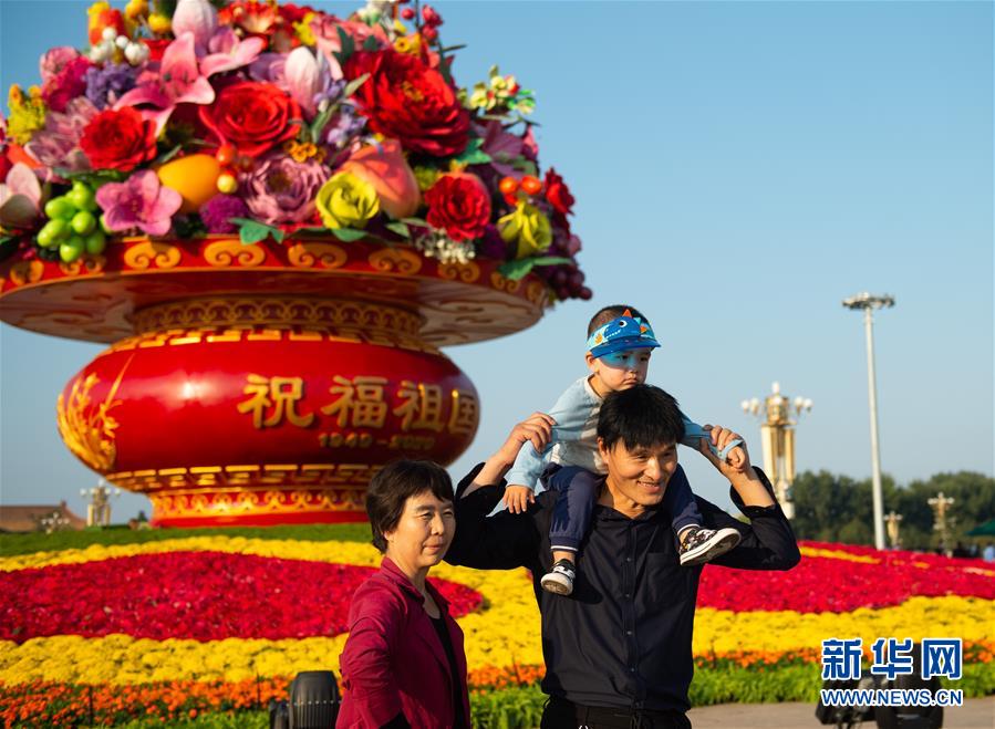 9月24日,游客在“祝福祖国”大花篮前拍照留念。 当日,“祝福祖国”大花篮主体完工,亮相天安门广场。大花篮顶高18米,篮内摆放有全国各地代表性“花卉”及富有吉祥寓意的“果实”,花坛底部则是由鲜花构成的10颗红心图案。大花篮计划于25日正式完工。 新华社记者 陈钟昊 摄