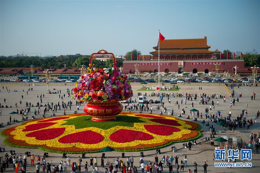 9月24日,游客们在天安门广场观赏“祝福祖国”大花篮。 当日,“祝福祖国”大花篮主体完工,亮相天安门广场。大花篮顶高18米,篮内摆放有全国各地代表性“花卉”及富有吉祥寓意的“果实”,花坛底部则是由鲜花构成的10颗红心图案。大花篮计划于25日正式完工。 新华社记者 陈钟昊 摄