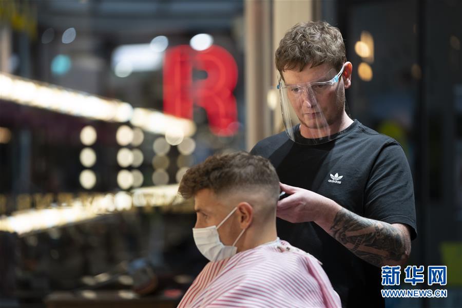9月24日,在英国曼彻斯特,理发师戴着面罩为顾客理发。 英国从24日开始采取多项严格的防控措施,英格兰地区所有酒吧、餐厅等营业场所要按照政府的防疫指引经营,晚上10时后必须停止营业。 新华社发(乔恩·休珀摄)