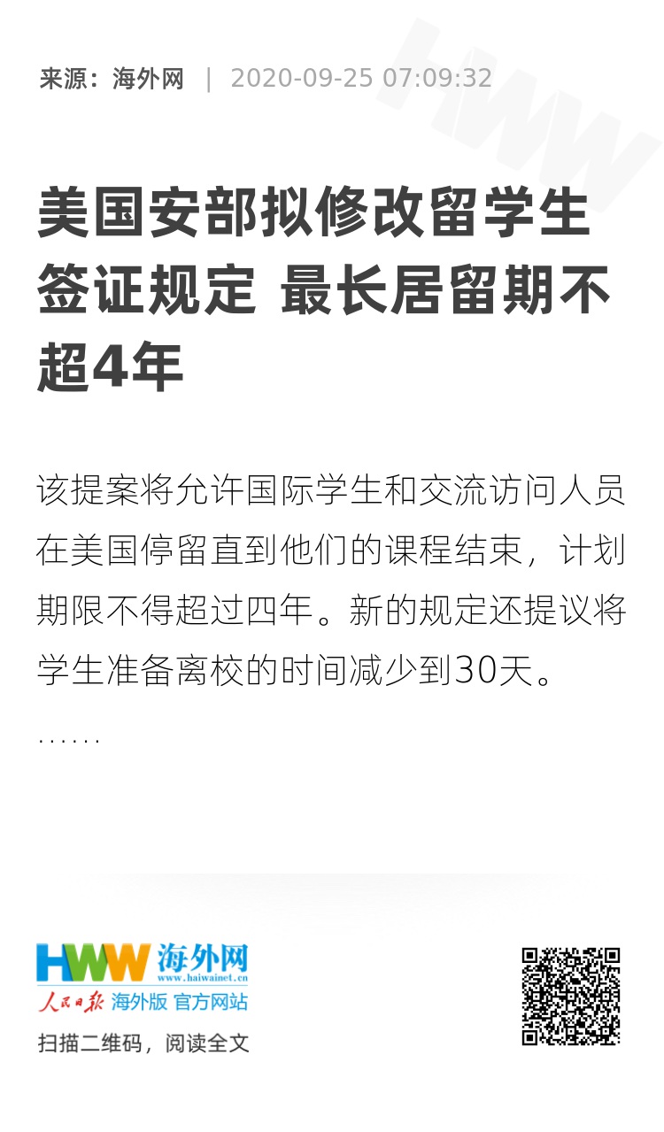 海外网9月25日电 美国《国会山报》(The Hill)当地时间9月24日报道,美国国土安全部提议对国际学生、交流访问人员和外国媒体代表的签证时限进行规范,新规定将制定“固定逗留期”,根据目前的规定,此类签证持有者只要“遵守准入条款”就可以留在美国。