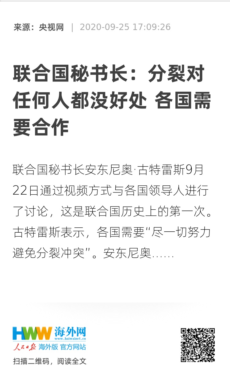 联合国秘书长安东尼奥·古特雷斯9月22日通过视频方式与各国领导人进行了讨论,这是联合国历史上的第一次。古特雷斯表示,各国需要“尽一切努力避免分裂冲突”。