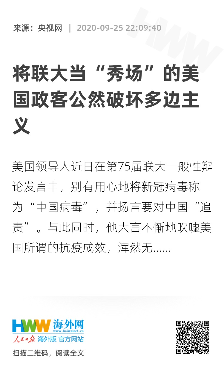 美国领导人近日在第75届联大一般性辩论发言中,别有用心地将新冠病毒称为“中国病毒”,并扬言要对中国“追责”。与此同时,他大言不惭地吹嘘美国所谓的抗疫成效,浑然无视在他讲话当日美国死亡病例突破20万这一悲惨事实,真是个巨大的反讽!众目睽睽下,美国政客将联大这一多边主义平台当作谋取私利的“秀场”,上演了一出“甩锅”推责、攻击抹黑、宣扬单边主义的政治闹剧,堪称是对联合国宪章原则以及国际社会尊崇的多边主义精神的玷污和极大破坏,激起全球公愤。