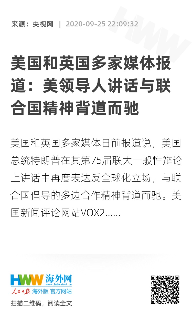 美国和英国多家媒体日前报道说,美国总统特朗普在其第75届联大一般性辩论上讲话中再度表达反全球化立场,与联合国倡导的多边合作精神背道而驰。