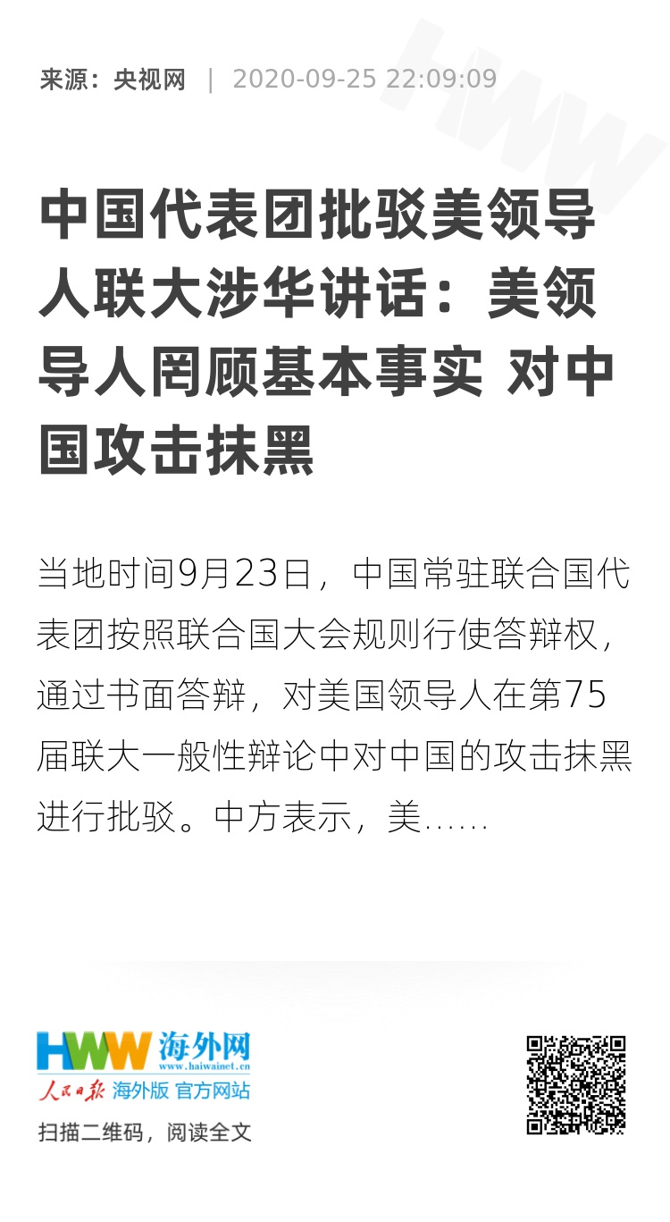 当地时间9月23日,中国常驻联合国代表团按照联合国大会规则行使答辩权,通过书面答辩,对美国领导人在第75届联大一般性辩论中对中国的攻击抹黑进行批驳。中方表示,美国领导人罔顾基本事实,对中国进行攻击抹黑,中方对此坚决反对。当今世界正面临新冠肺炎的严峻挑战,面临单边主义、保护主义、霸凌行径的严重威胁。此时此刻,世界需要团结合作而不是对抗,需要相互信任而不是传播“政治病毒”。