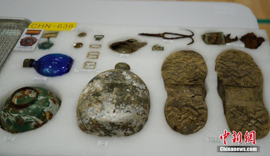 中韩9月26日在韩国仁川举行第七批在韩中国人民志愿军烈士遗骸装殓仪式。图为现场展示的部分挖掘出的遗物。中新社记者 曾鼐 摄