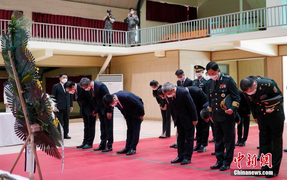 中韩9月26日在韩国仁川举行第七批在韩中国人民志愿军烈士遗骸装殓仪式。图为中方代表现场进行悼念活动。中新社记者 曾鼐 摄