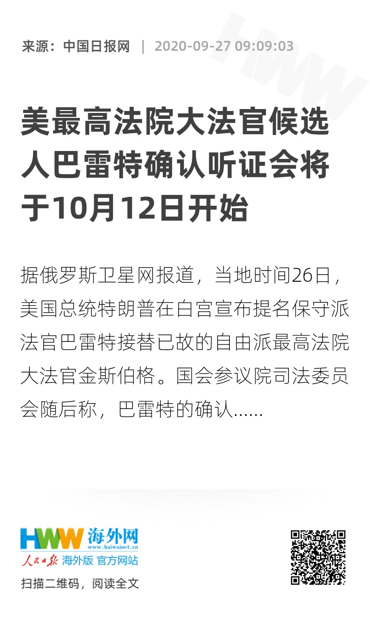 据俄罗斯卫星网报道,当地时间26日,美国总统特朗普在白宫宣布提名保守派法官巴雷特接替已故的自由派最高法院大法官金斯伯格。国会参议院司法委员会随后称,巴雷特的确认听证会将在10月12日开始,并将持续三至四天。
