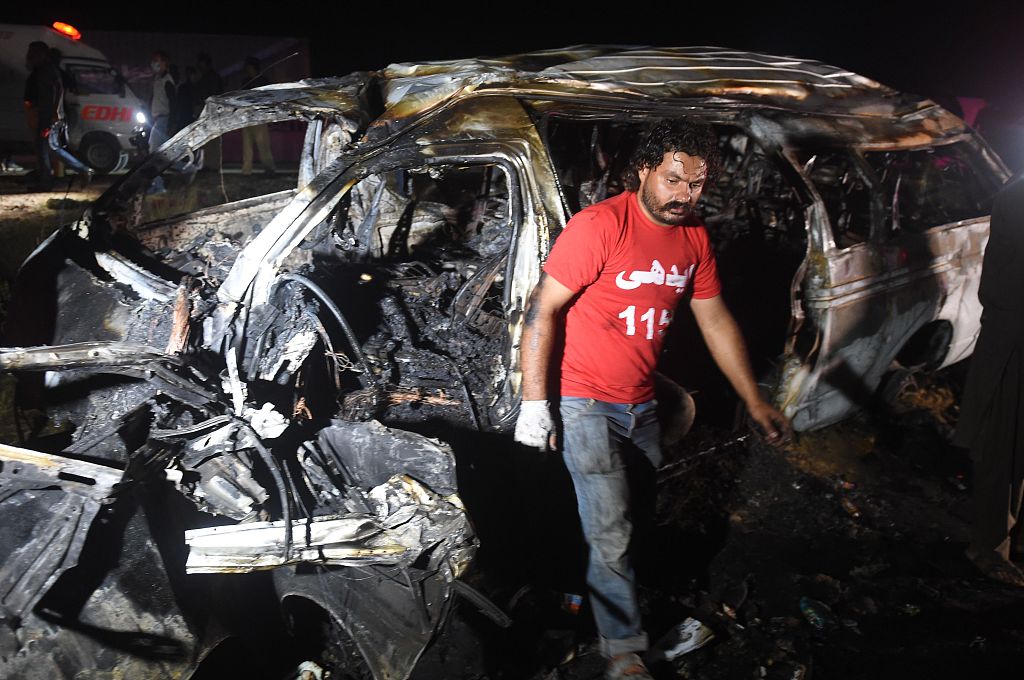 2020年9月27日讯,巴基斯坦警方26日说,一辆客车当晚在南部信德省翻车后起火,造成13人死亡、7人受伤。巴基斯坦媒体援引警方消息报道说,这辆客车车况较差,车上载有约20人,原计划从信德省海得拉巴市前往卡拉奇市。客车26日晚在高速公路上出现机械故障后翻车起火,客车被烧毁。图片来源:视觉中国