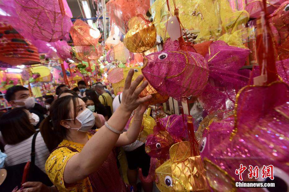9月27日,大量市民入内选购心仪的传统灯笼。中秋节即将到来,位于香港元朗大桥街市的香烛小店布置成“灯笼街”,挂起数百个传统纸扎灯笼,吸引大量市民入内选购。 中新社记者 李志华 摄
