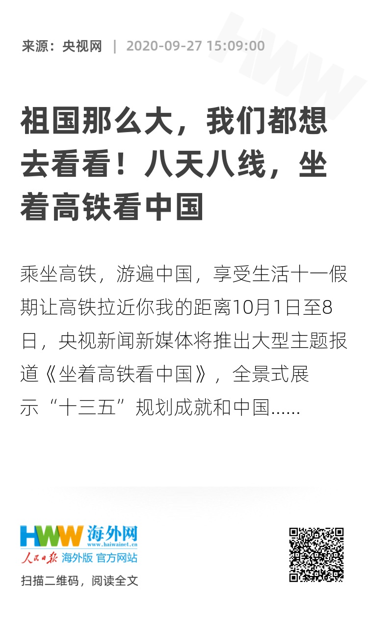 10月1日至8日,央视新闻新媒体将推出大型主题报道《坐着高铁看中国》,全景式展示“十三五”规划成就和中国之美。8天8条主线,带你走遍大好河山,聆听中国故事。