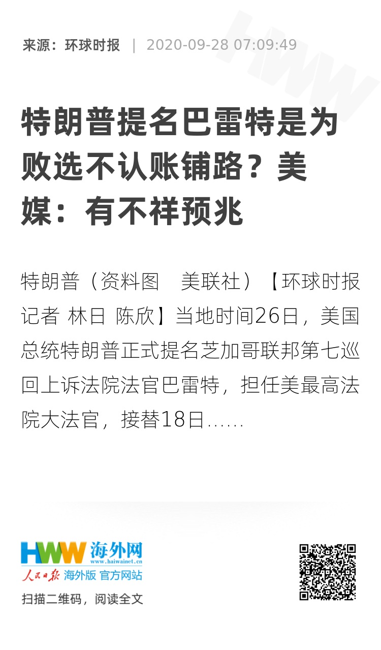 原标题:《特朗普提名巴雷特担任美最高法院大法官,美媒:权力争夺大战正式打响》